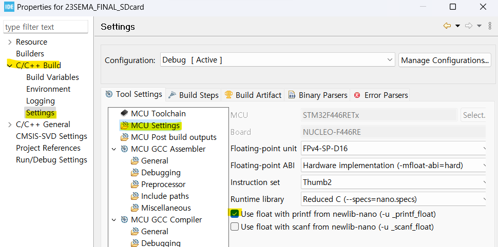 - C/C++ Build > Settings > MCU Settings >
